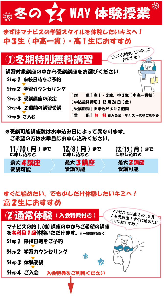 平日 15:00~22:00土曜 13:00~22:00祝日 10:00~22:00日曜 10:00~18:00※年間では休館日があります。※時期によって開館時間が異なることがあります。詳細は校舎にお問い合わせください。