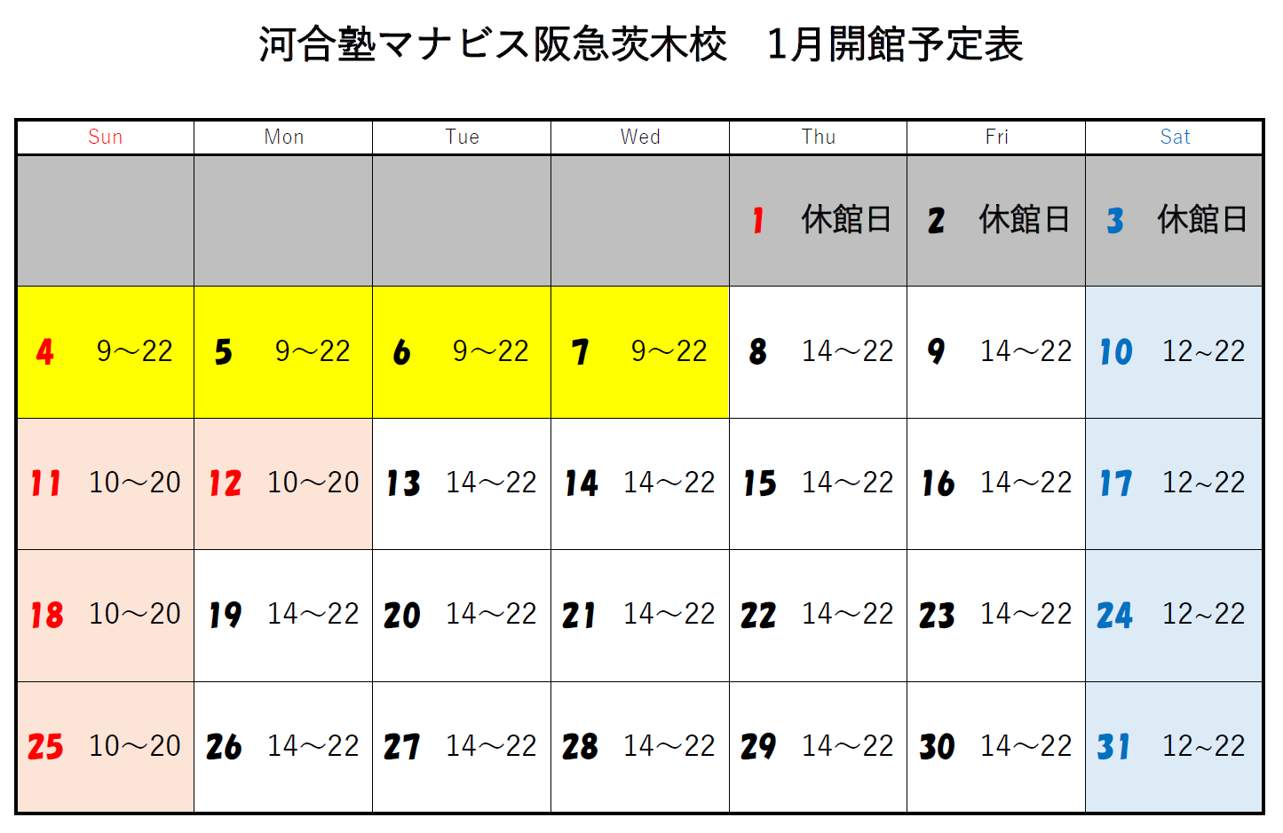 平日 14:00~22:00土曜 12:00~22:00日曜・祝日 10:00~20:00※年間では休館日があります。※時期によって開館時間が異なることがあります。詳細は校舎にお問い合わせください。