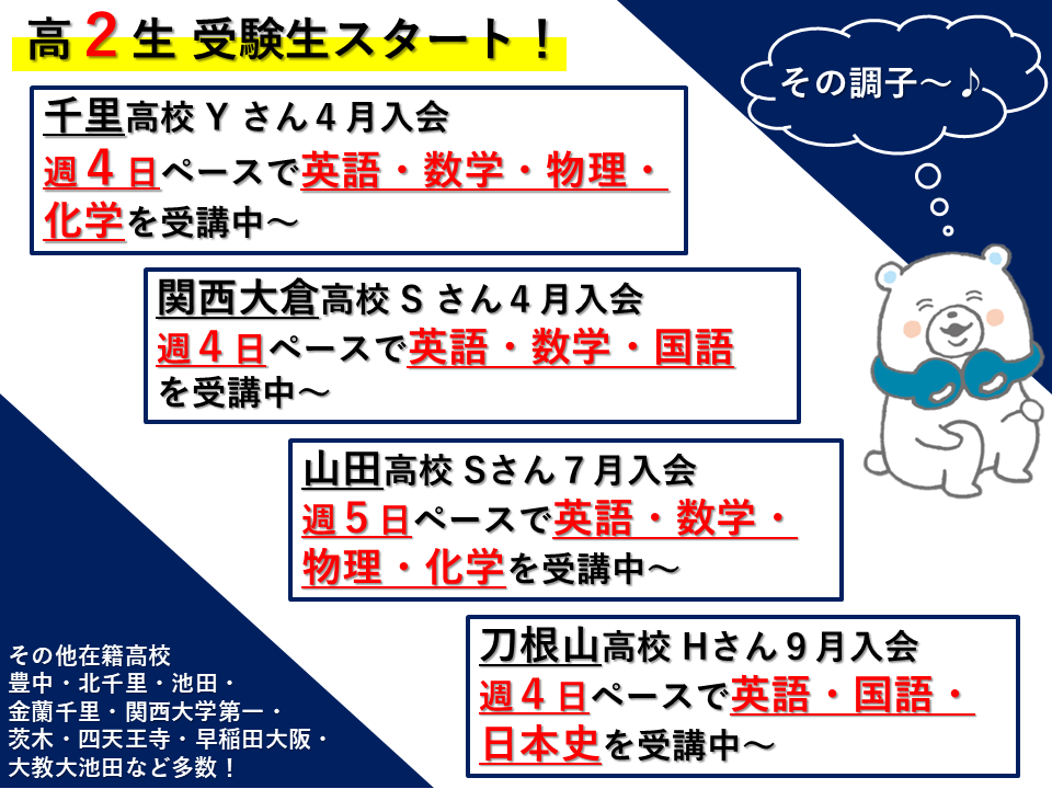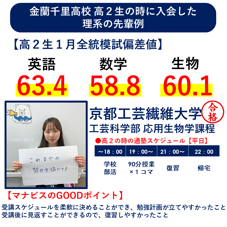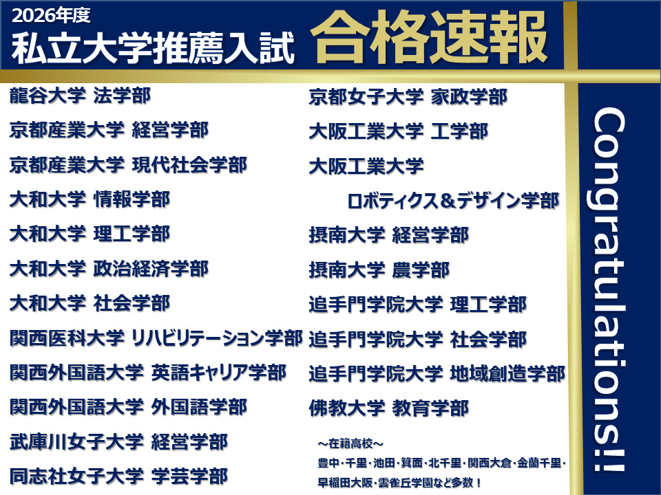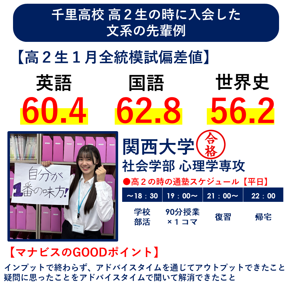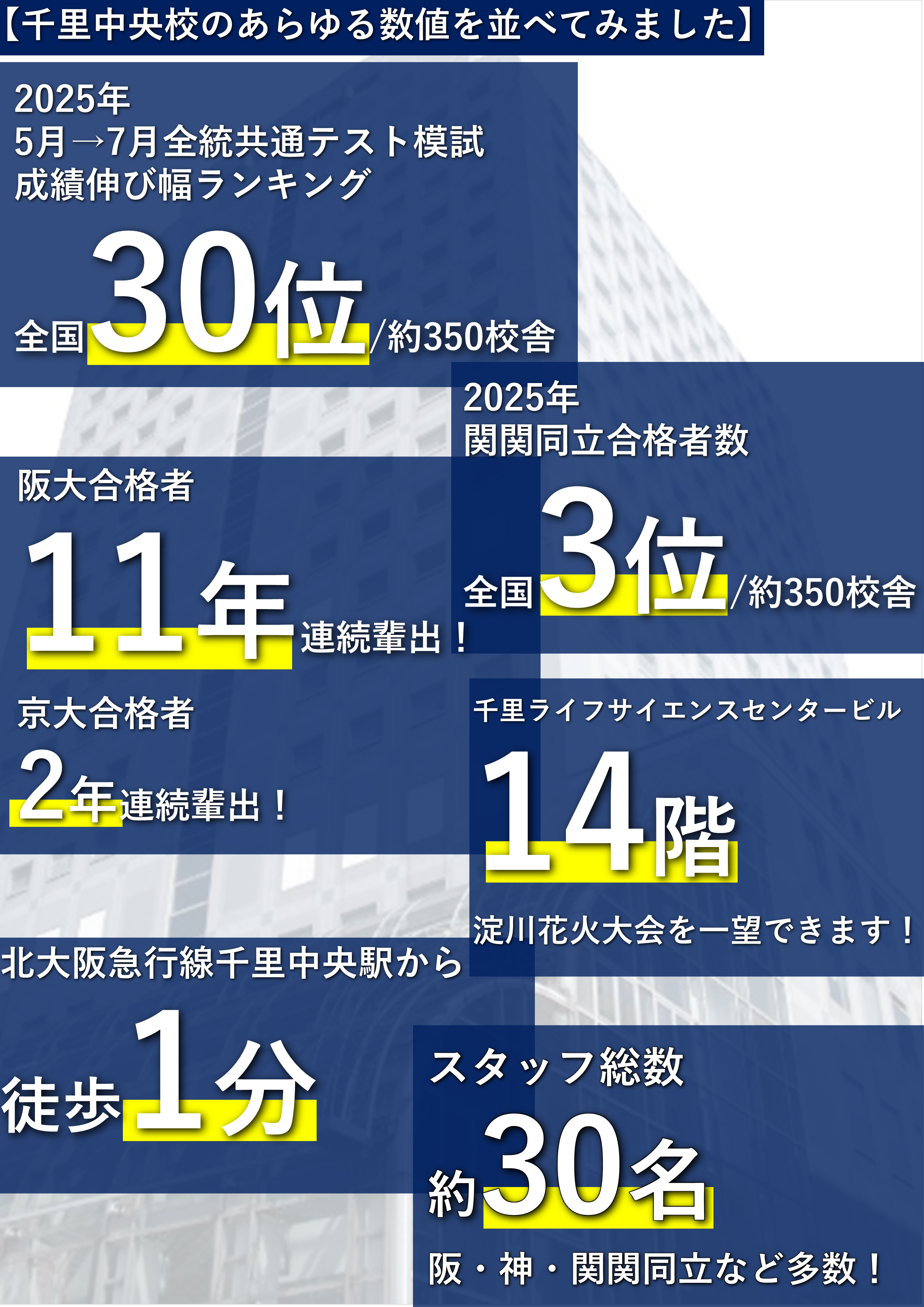 河合塾マナビス千里中央校は開校12年目を迎えました。 豊中高校・千里高校・箕面高校・池田高校・北千里高校をはじめ、 非常に多くの高校生に選ばれている塾・予備校です。 全国のマナビスの中でも屈指の合格実績を誇る校舎として、 1人1人との対話を大切にしながら指導をしています。 個別指導や集団授業の塾をお考えの方も、ぜひ一度校舎見学にお越しください!