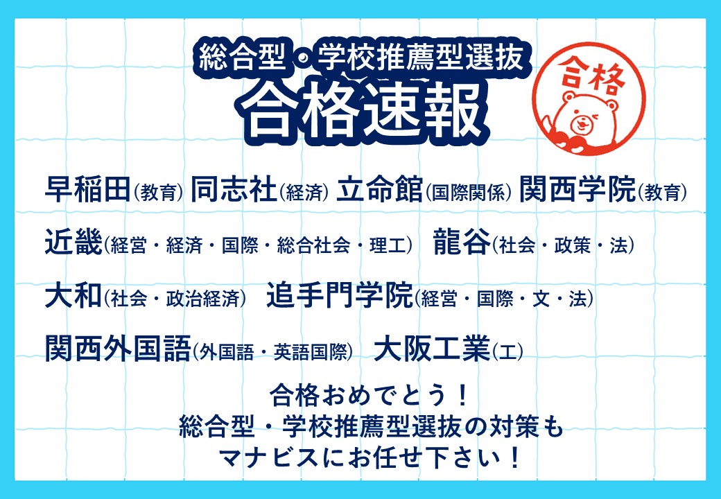 河合塾マナビス豊中校は開校13年目を迎えました。 阪急宝塚沿線にお住まいの方、校舎近隣の高校にお通いの方に 選ばれている学習塾・予備校です。 大学受験対策、定期テストの得点アップ、進路・学習相談など、 高校生のみなさんの「学びたい」にお応えします。 河合塾マナビスの映像授業と学習サポートをぜひ体験してみてください。 【主な在籍高校】 北野 豊中 池田 箕面 桜塚 刀根山 千里 茨木 履正社 大教大池田 雲雀丘学園 追手門学院 等