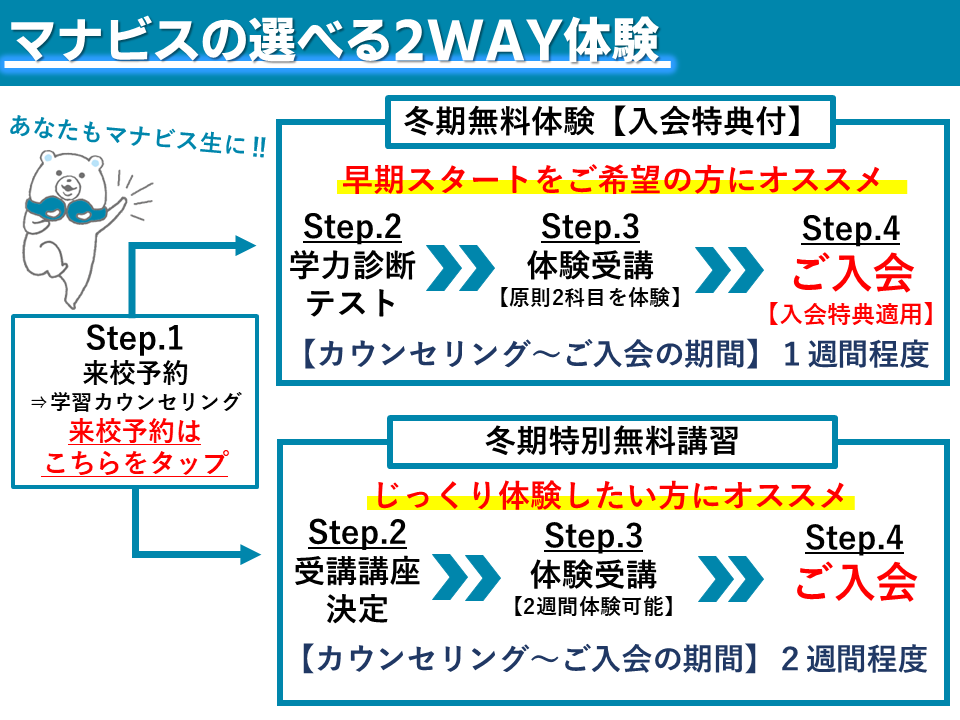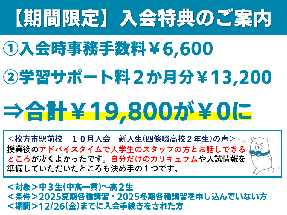 ・冬の無料体験イベント実施中! ・スタッフ紹介 ・枚方市駅前校のサポート体制 ・過去問対策はお任せください! ・高2生の皆さんへ ・高1生の定期試験対策 ・校舎へのアクセス
