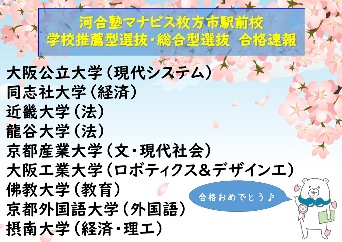 ・学校推薦型選抜・総合型選抜合格速報 ・冬の無料体験イベント実施中! ・スタッフ紹介 ・枚方市駅前校のサポート体制 ・入試直前期の対策はお任せください! ・高2生の皆さんへ ・高1生の定期試験対策 ・校舎へのアクセス