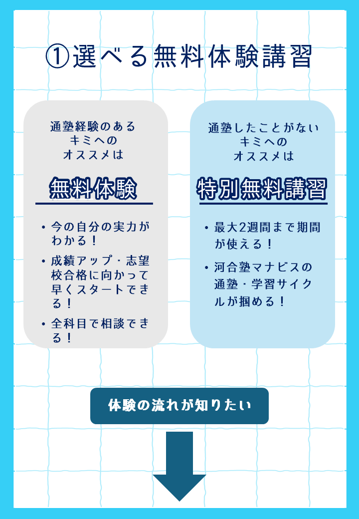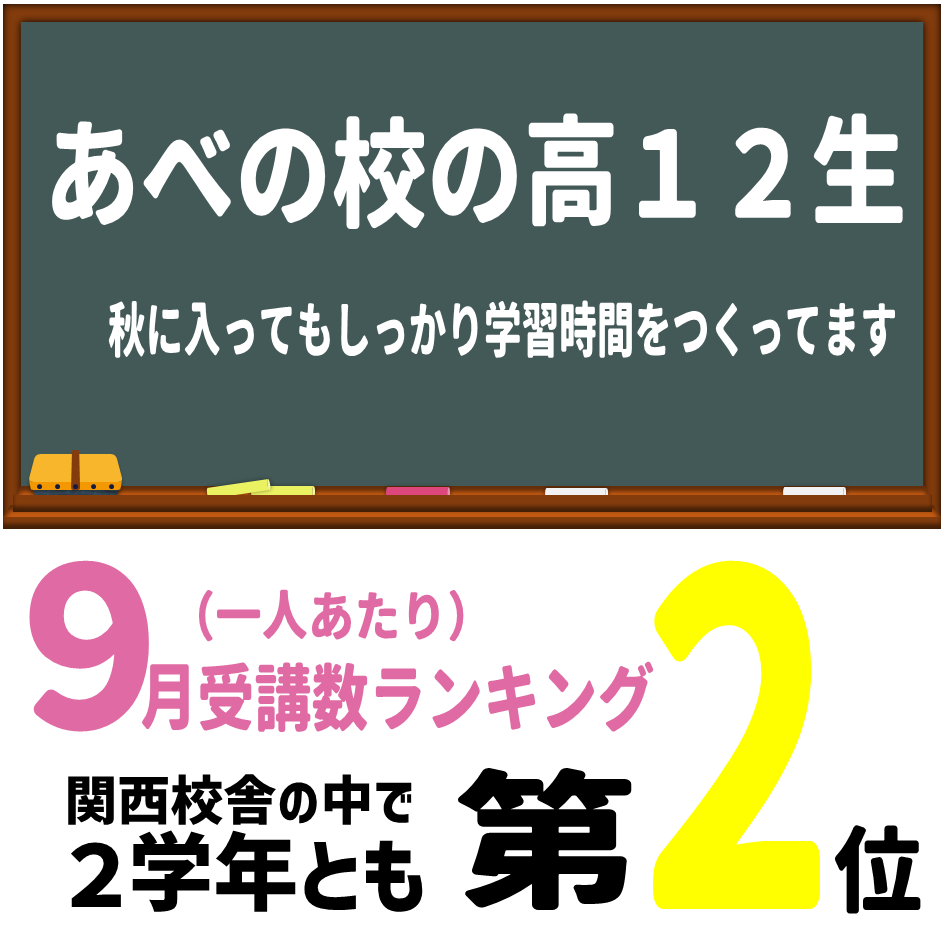 現役高校生の生徒さんにとって 「続けやすさ」と「通いやすさ」は 志望校・さらにそのひとつ上の 現役合格を目指すためには とても重要な指標! フォローを受けながら カリキュラムを進めていけるので 「続けやすい」 あべのキューズモールの真ん前なので 「とにかく通いやすい」 キミの勝ちたい気持ちを 河合塾マナビスあべの校は 応援します! あべの校受講スケジュールの一例 高2生10月以降 (10月で高3へ進級します)
