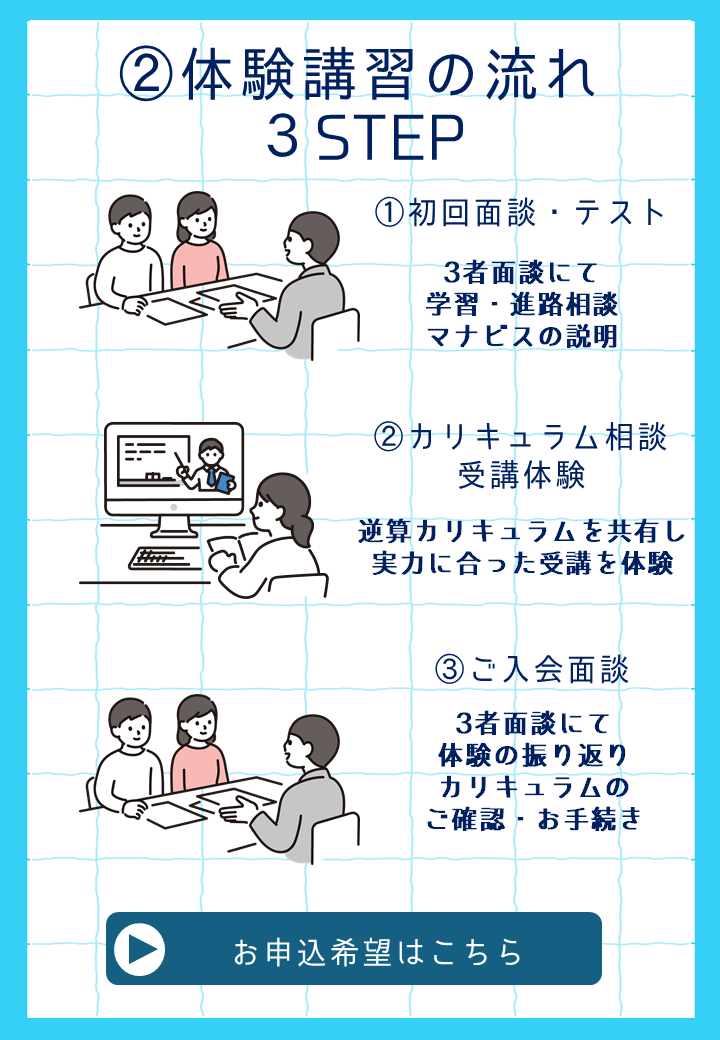 【お問い合わせ先】 河合塾マナビスあべの校 【電話】:06-4703-3813 【受付時間】:平日・土曜日/14:00~21:30、日曜日・祝日/10:00~17:30 【住所】:〒545-0052 大阪市阿倍野区阿倍野筋2-1-29AITビル3F 【交通】:JR・地下鉄御堂筋線「天王寺」駅 近鉄南大阪線「大阪阿部野橋」駅 大阪メトロ谷町線「阿倍野」駅 徒歩2分