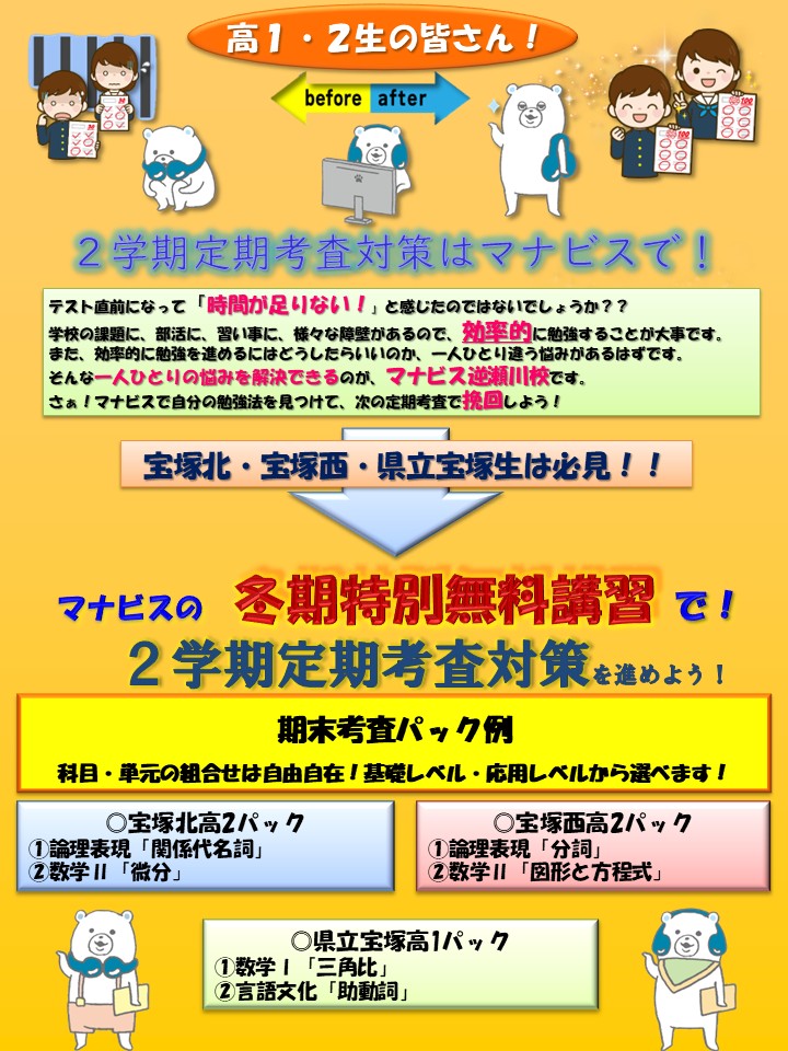 気になるページをクリック! ①高校1・2年生のみなさんへ ②河合塾マナビス逆瀬川校 志望校合格までのポイント ③逆瀬川校の特徴 ④逆瀬川校へのアクセス