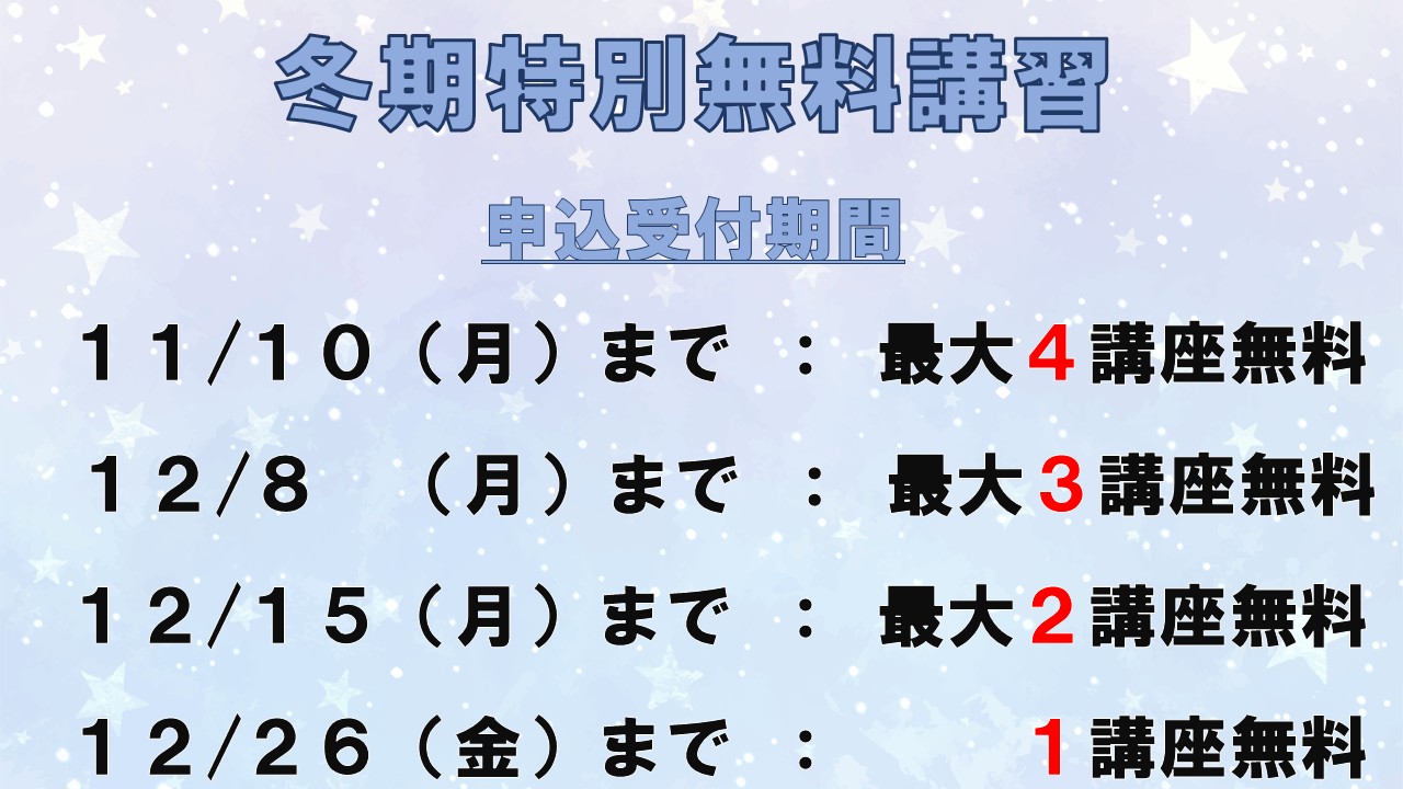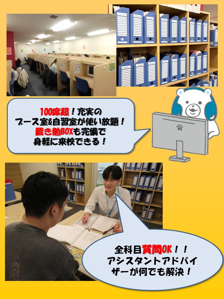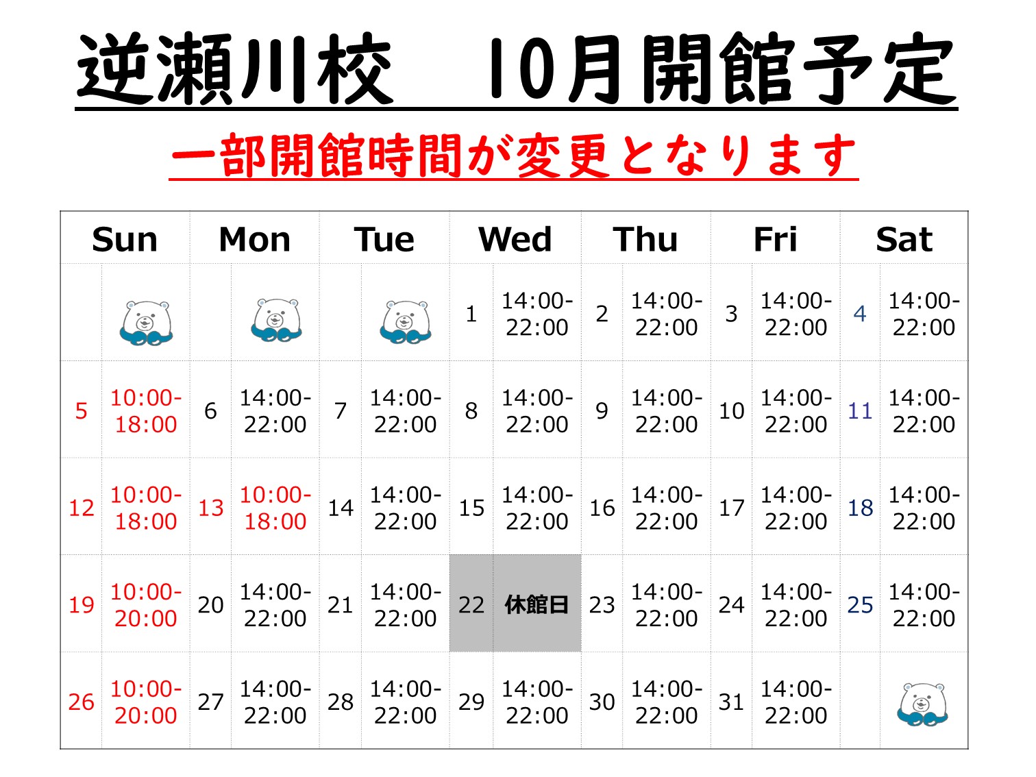 平日・土曜 14:00~22:00日曜・祝日 10:00~18:00※年間では休館日があります。※時期によって開館時間が異なることがあります。詳細は校舎にお問い合わせください。