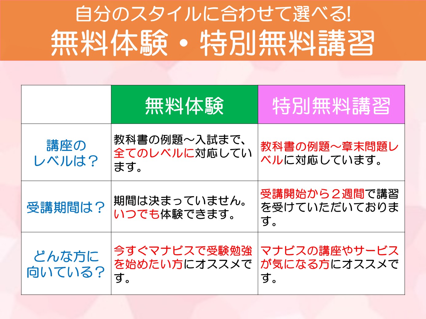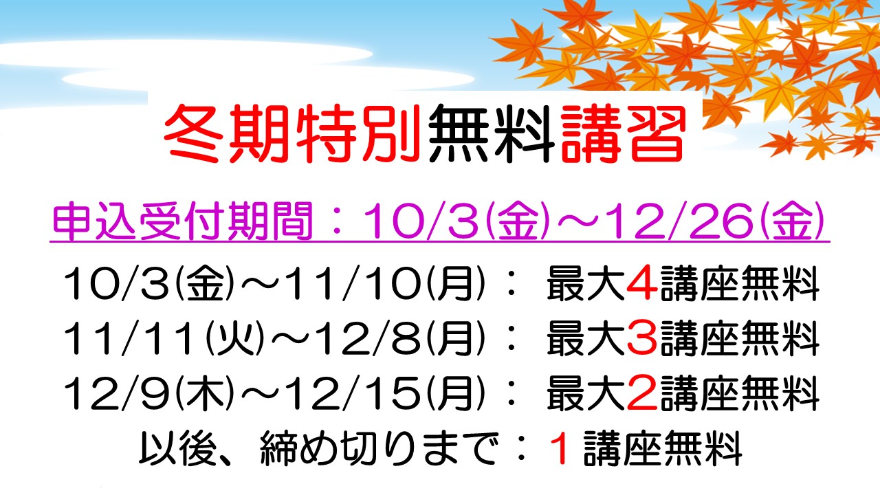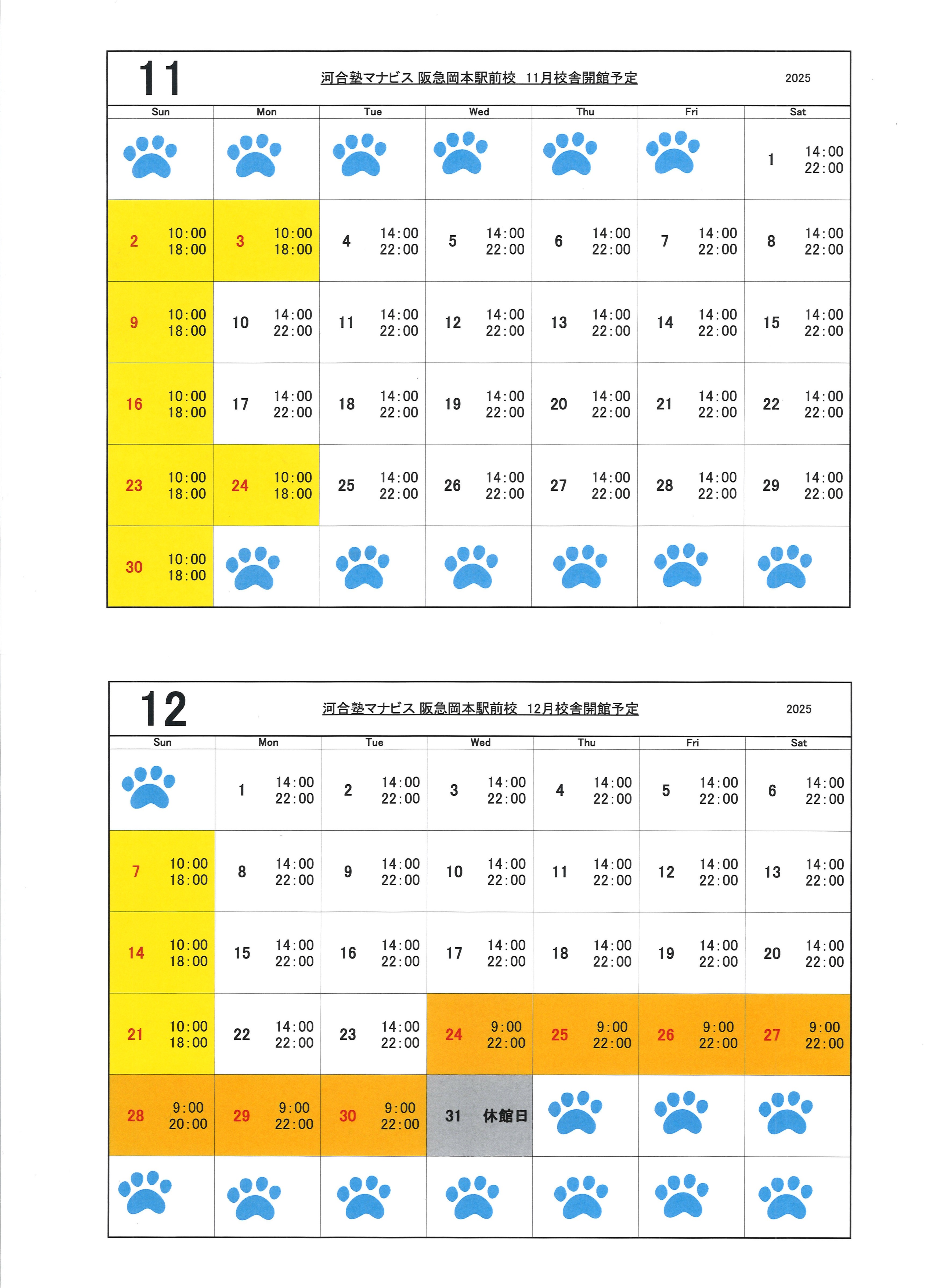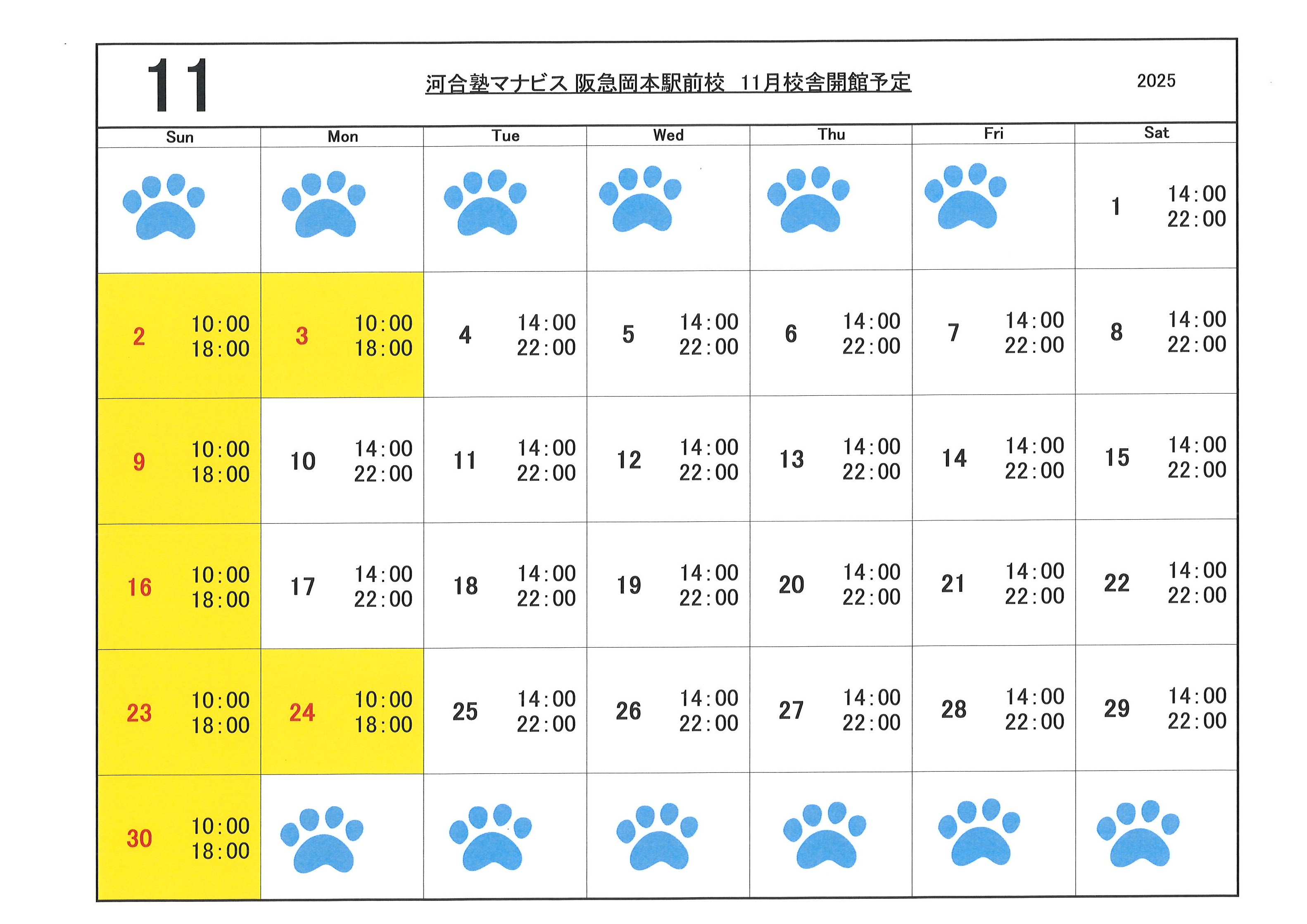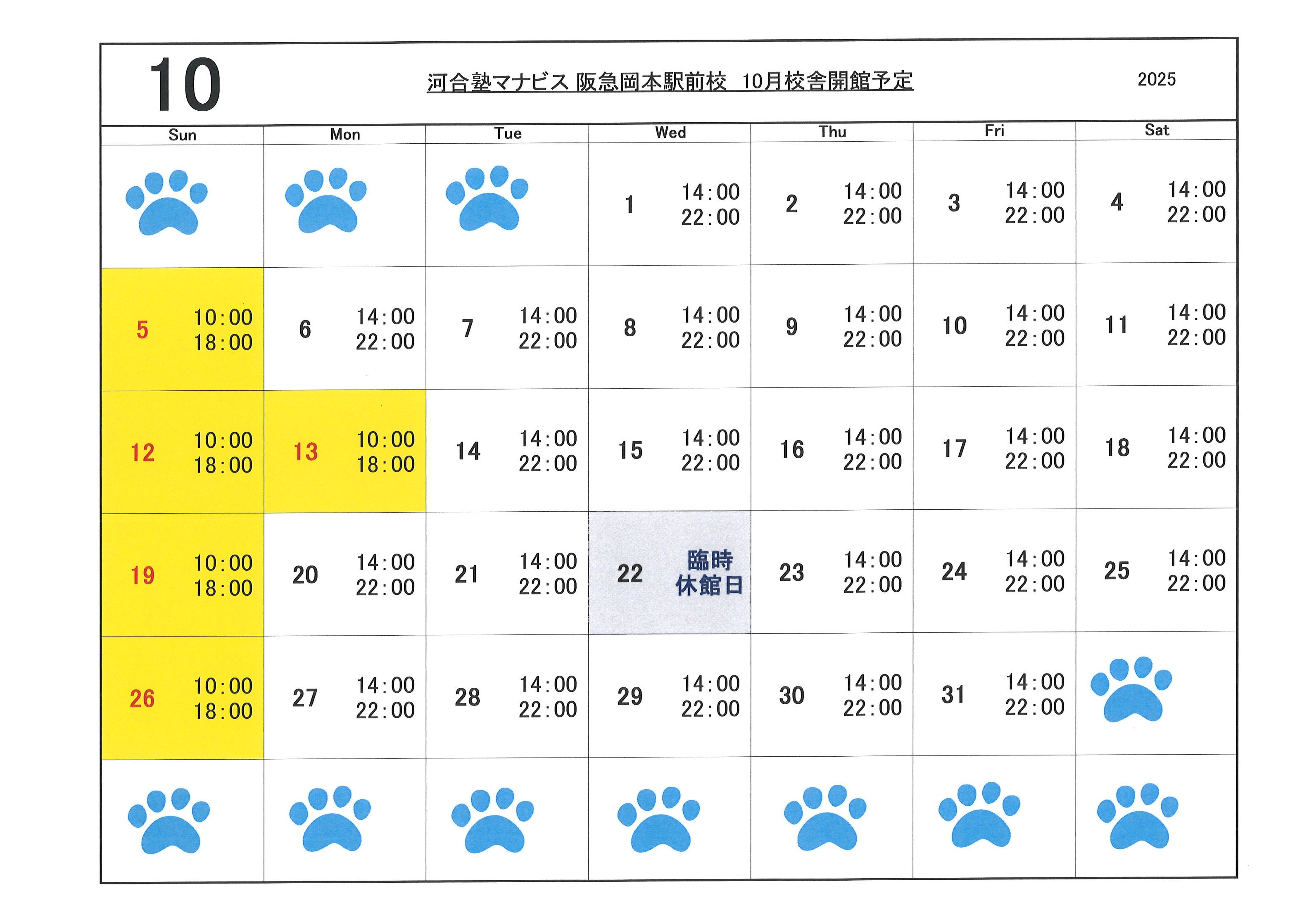 平日・土曜 14:00~22:00日曜・祝日 10:00~18:00※年間では休館日があります。※時期によって開館時間が異なることがあります。詳細は校舎にお問い合わせください。