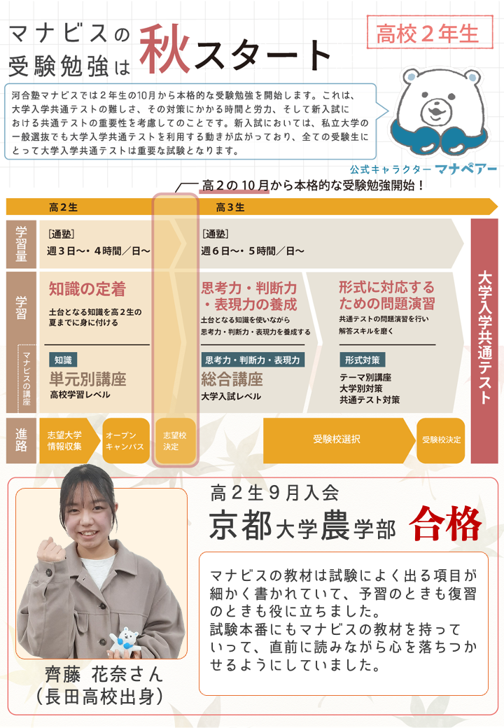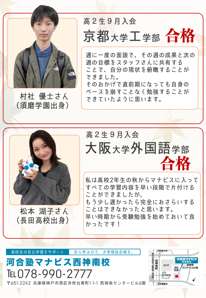 河合塾マナビスには、 京都大、大阪大、神戸大をはじめとする難関国公立大、 同志社大、立命館大、関西学院大、関西大など、 幅広い合格実績と進路指導のノウハウがあります。