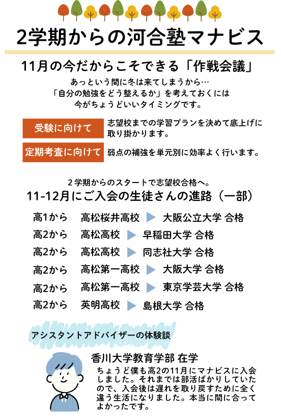 HPをご覧いただきありがとうございます!河合塾マナビス瓦町フラッグ校は、現役高校生(+中高一貫中3生)を対象とした高松市の塾です。