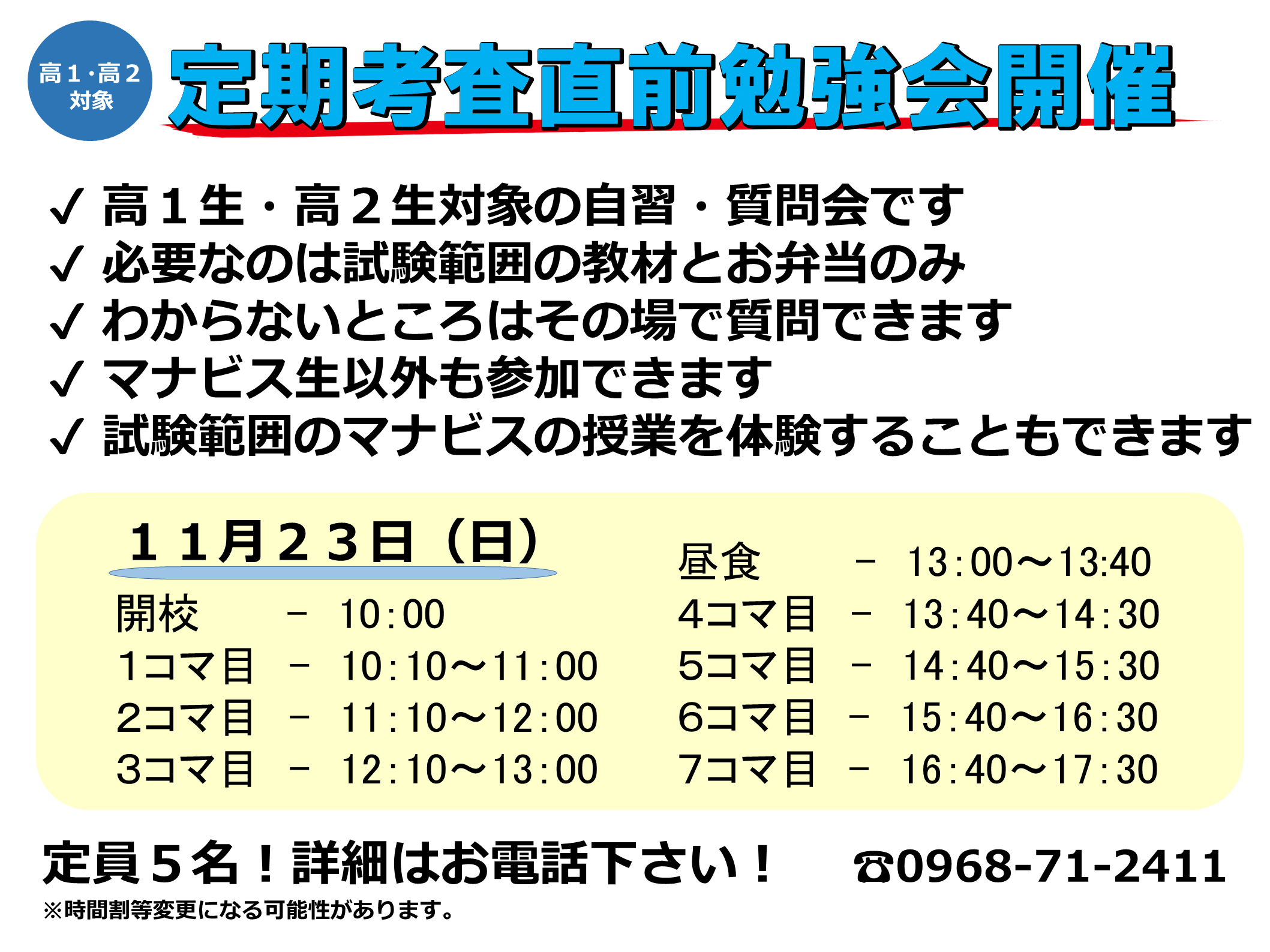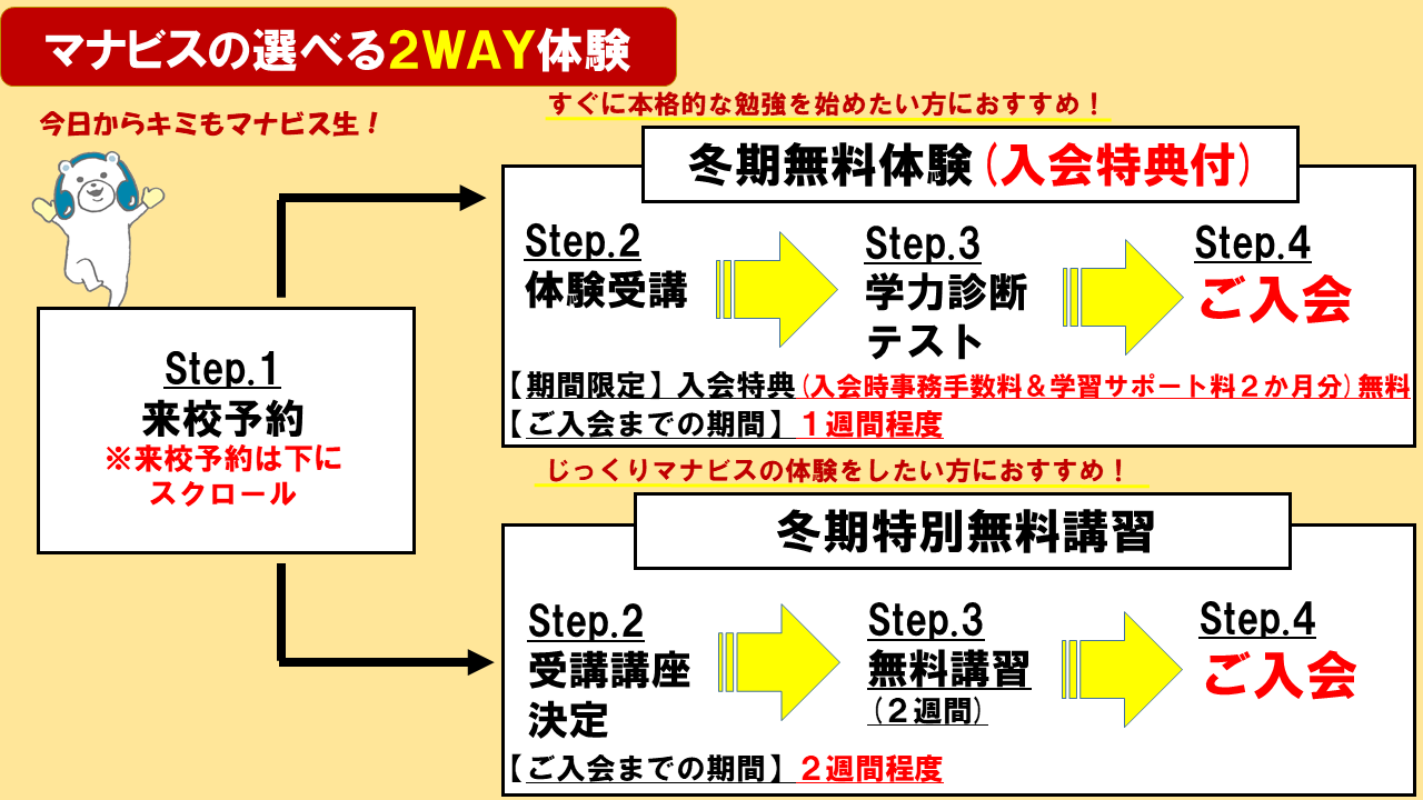 平日 14:00~22:30土曜・祝日 13:30~22:00日曜 休館※年間では休館日があります。※時期によって開館時間が異なることがあります。詳細は校舎にお問い合わせください。