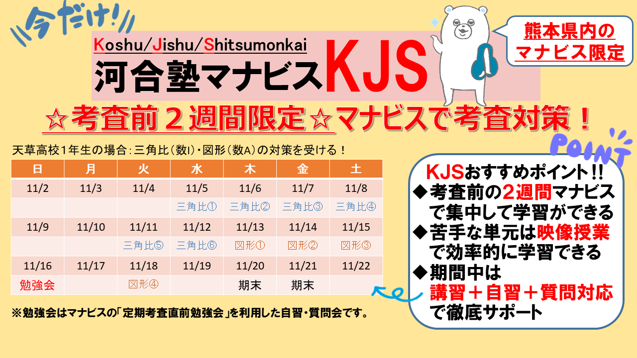 ↑こちらのページでは河合塾マナビスと他塾の違いについて 詳しくご覧いただけます。 天草の地から全国トップレベルの講師の映像授業が受講できます。 河合塾マナビスの講座・カリキュラムについては こちらのページをご参照ください。 河合塾マナビス本渡校は熊本ゼミナール本渡校に 併設されています(3階がマナビス) 休校日を除き毎日通う生徒さんもいらっしゃいます。 河合塾マナビスの授業や学校課題の予習・復習に いつでも利用できます。 勉強の合間にひと休みをするための 休憩ブースも利用できます。 アドバイザーの清永です。河合塾マナビスは、高品質な映像授業と親身な学習ナビゲーションで、皆さんを合格へと導いていきます。まずはお気軽にご来塾ください。 【お電話でのお問い合わせ】 0969-24-3021